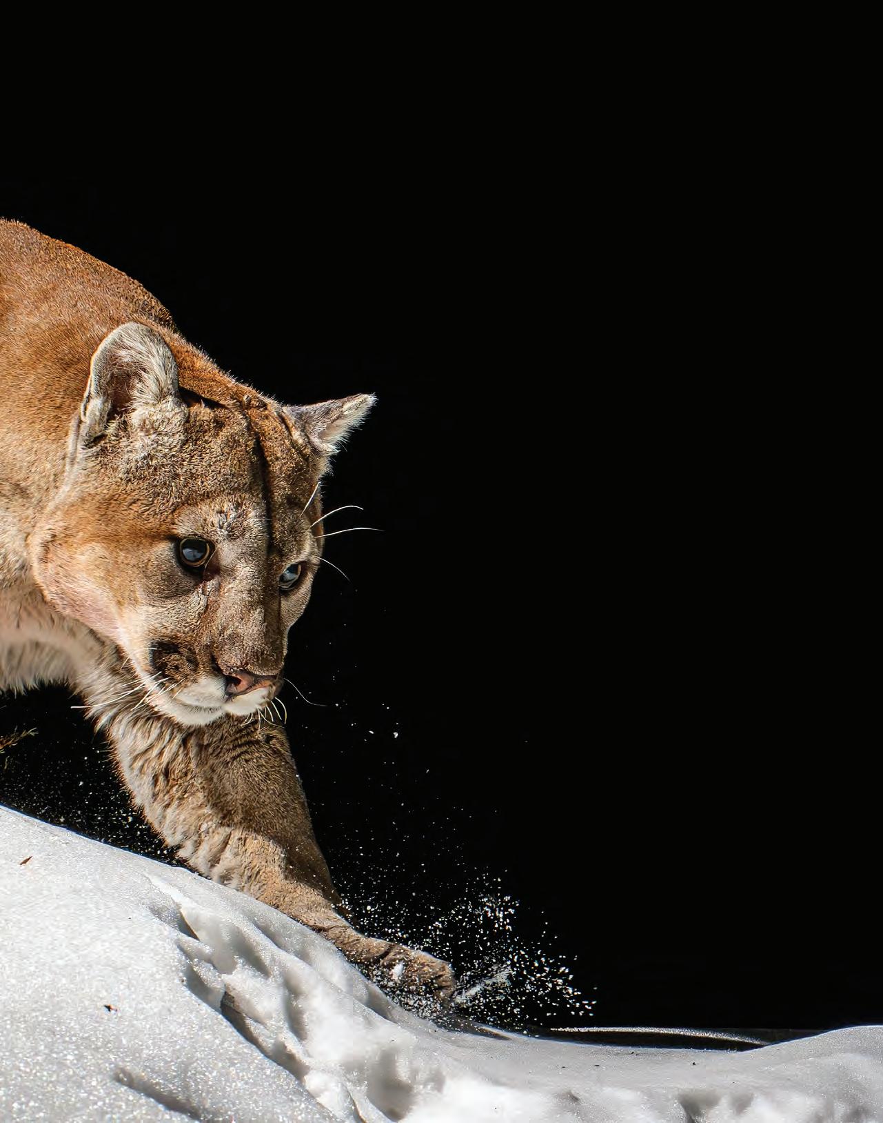 A mountain lion (Puma concolor) glides through fresh snowfall before midnight near Estes Park, every muscle and whisker caught sharply by a camera trap. Story begins on page 18.