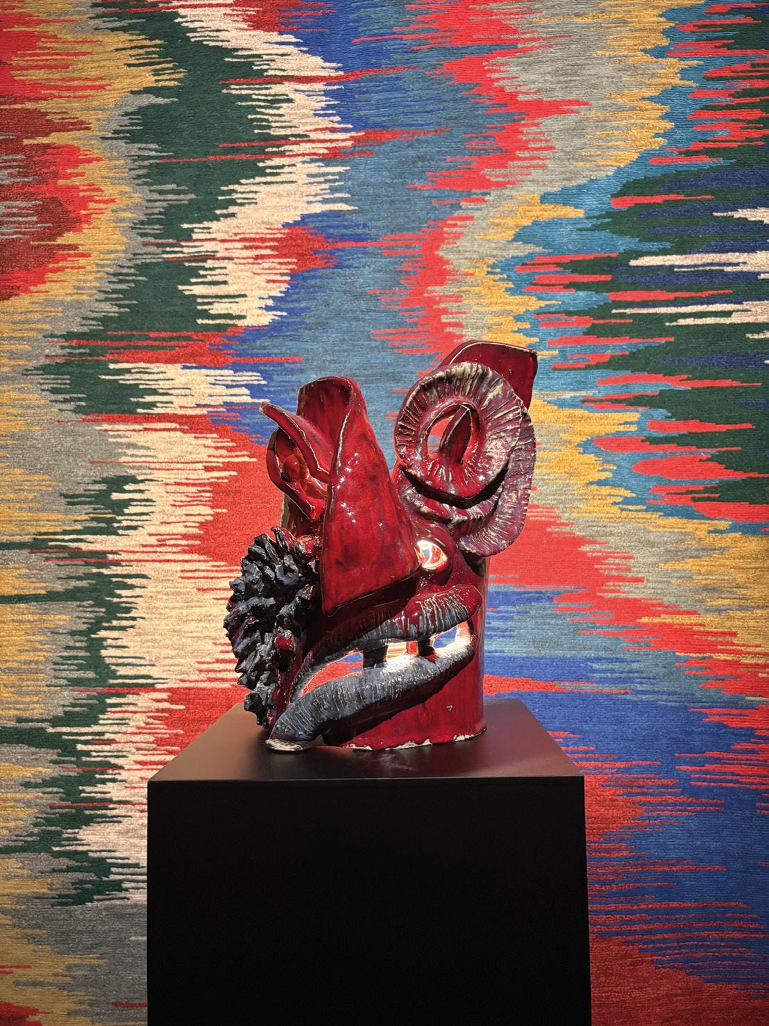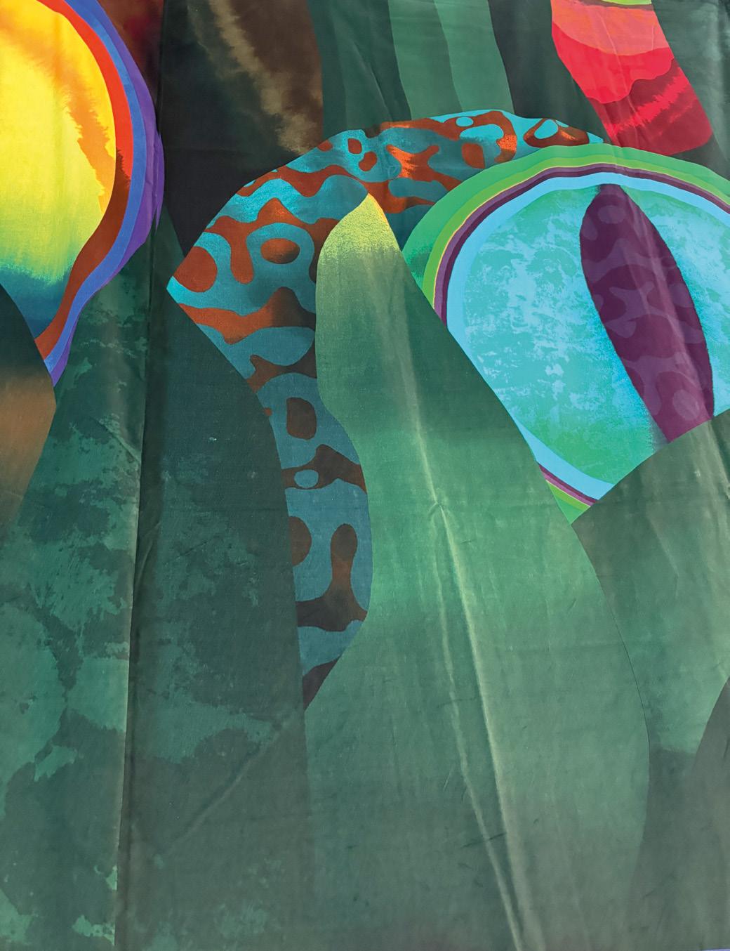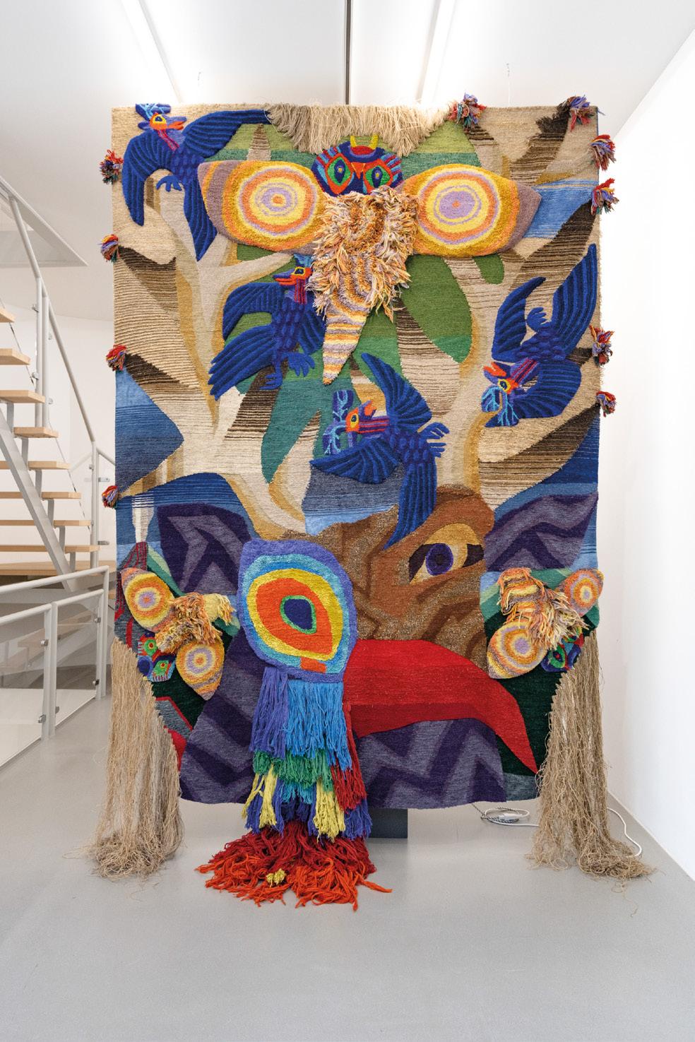 Christoph Hefti is a storyteller and tireless creator of captivating atmospheres. The visual worlds of the textile designer and artist often move in the realm of the mystical or even the uncanny. Figures, animals, and mythical creatures populate scenes in fantasy landscapes of forests, rivers, and volcanoes. Recurring motifs such as oversized eyes and expressive masks directly address the viewers.
