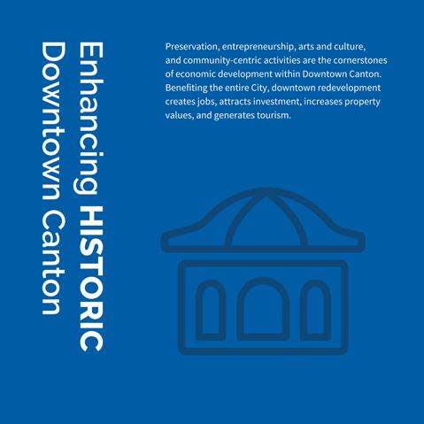 Preservation, entrepreneurship, arts and culture, and communitycentric activities are the cornerstones of economic development within Downtown Canton. Benefiting the entire City, downtown redevelopment creates jobs, attracts investment, increases property values, and generates tourism.