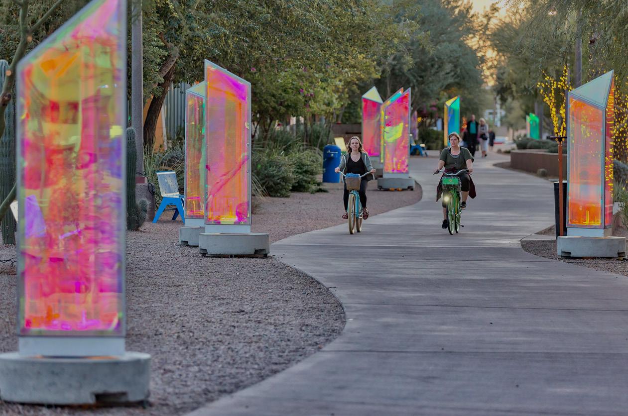 An investment in temporary public art projects in a specific geographic area can make a high impact with relatively low costs. Some communities develop a sculpture tour program in which plinths are poured and sculpture rotates annually. Other communities invest in temporary sculpture on parklets, privately owned walls, or in street trees that are small-scale, enhancing the pedestrian experience for those within the specific geographic area.