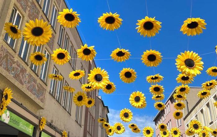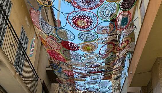 Suspended artwork can be made from a number of materials with varying lifespans, making it an exciting strategy to transform a conventional gathering site— such as a re-imagined alley or a municipal park—into an extraordinary, wondrous place for leisure or respite. To install a suspended artwork or sculpture, permission from neighboring property owners may be required, if the suspension infrastructure is to be placed on their property. These artworks are most effective in pedestrian-only spaces so that artwork visitors can safely photograph and marvel at the artwork above.
