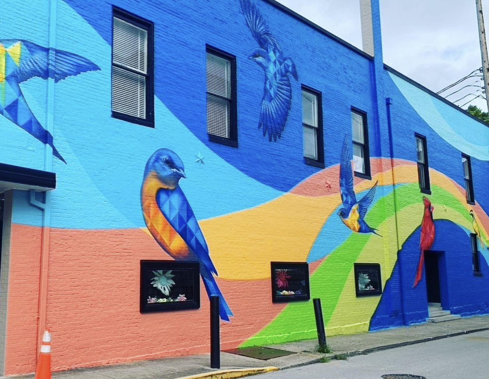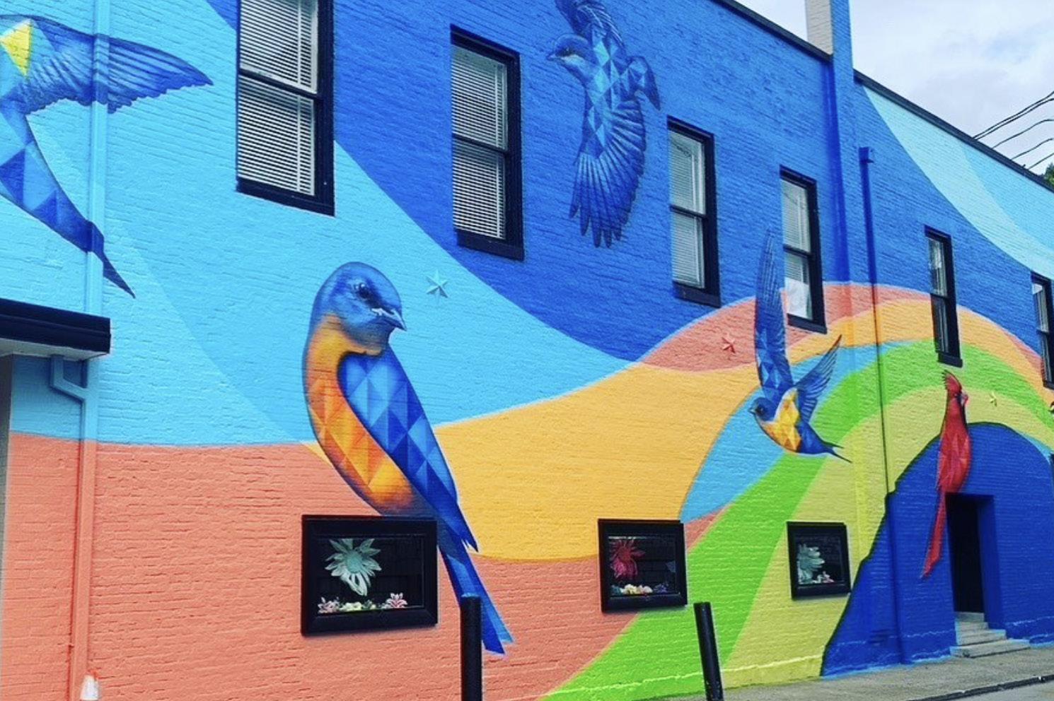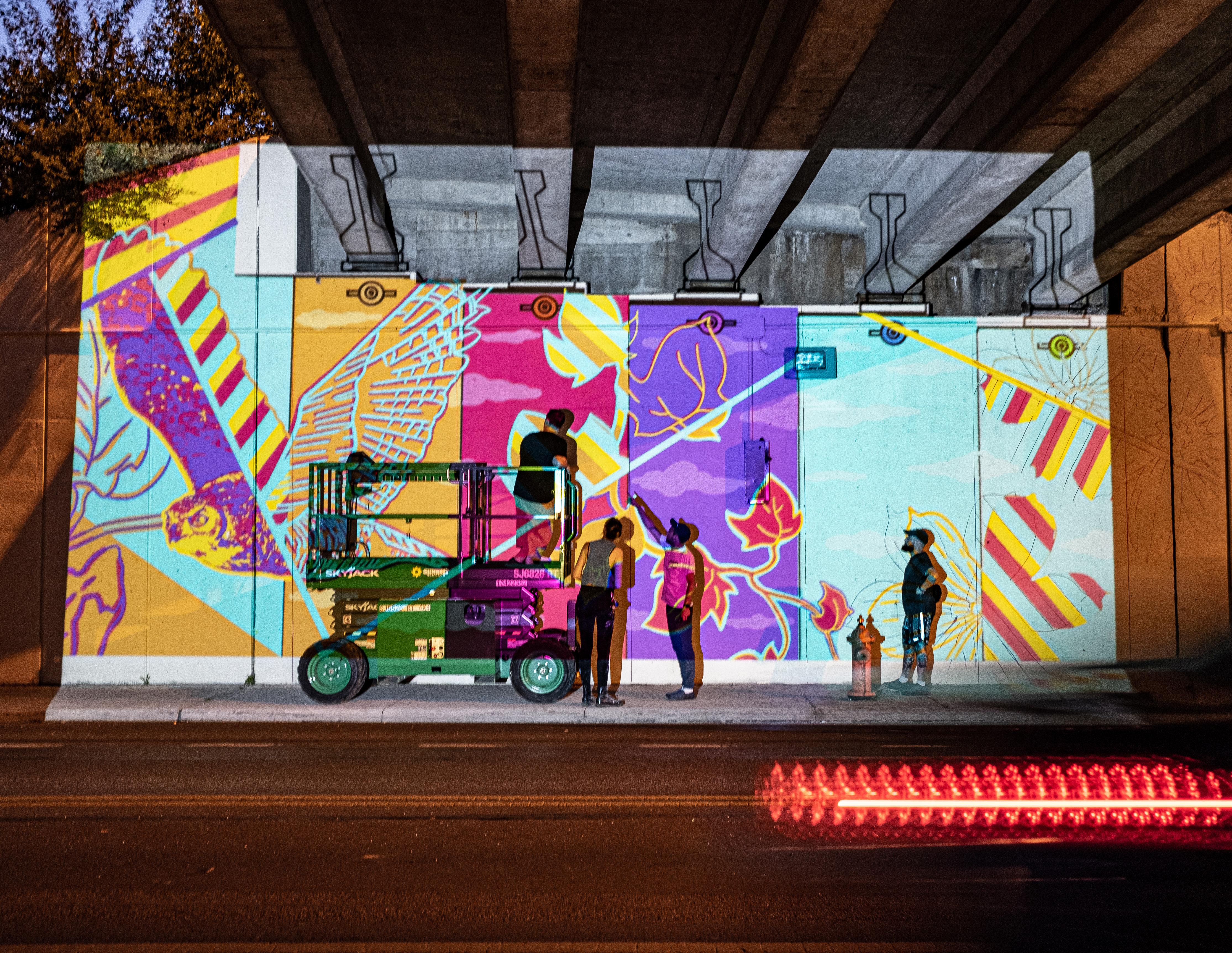 Murals are large-scale, two-dimensional compositions that can be: 1) painted onto the surface 2) graphic reproductions printed onto vinyl that is adhered to a surface, or 3) painted onto a panel that is affixed to a building. Environmental conditions, artwork display duration, artist ability, timeline, and budget are all considerations for which mural application style is suitable for a project.