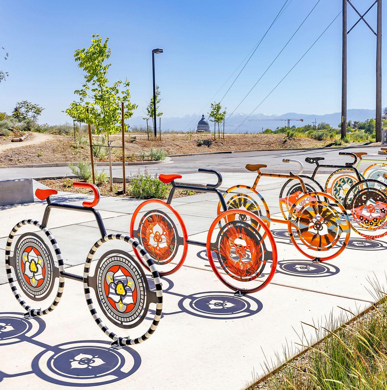 Functional art is ordinary infrastructure that has been reimagined and designed by an artist. Integrating unique designs into infrastructure may be an affordable and efficient way to create a major visual impact. Some possible options for functional art installations include bike racks, planters (either suspended or installed on the ground), benches, play equipment, medians, subdivision walls, trash cans, transit stops, storm drains, manholes, monument signage, sidewalk treatments, and more.