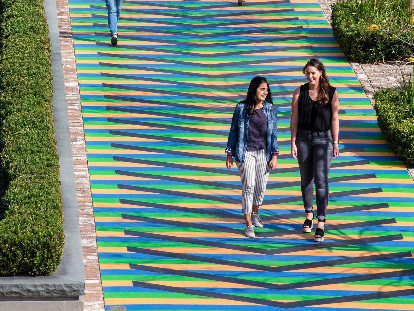 Murals are two-dimensional compositions that can take many forms, including paint or tile applied directly onto a surface, graphic reproductions printed onto vinyl adhered to a surface, or created on a panel that is affixed to the building. Environmental conditions, artwork display duration, artist ability, timeline, and budget are all considerations that affect which mural application style is suitable for a project. While curating permanent works of art as part of the collection is important, ephemeral works such as murals allow for the exposure of many artists over a short period of time rather than a few artists over a long period of time.
