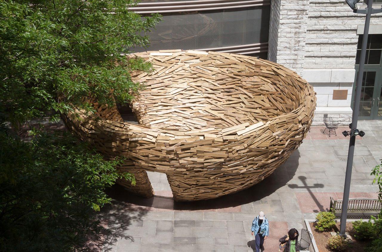 Environmental art is any kind of outdoor public art that uses materials with a direct connection to nature, landscaping, or organic materials. Environmental art can be temporary or permanent, and its scale can vary. Its thematic context often addresses environmentalism and sustainability, but it can also call attention to the City’s existing landscape and natural settings.