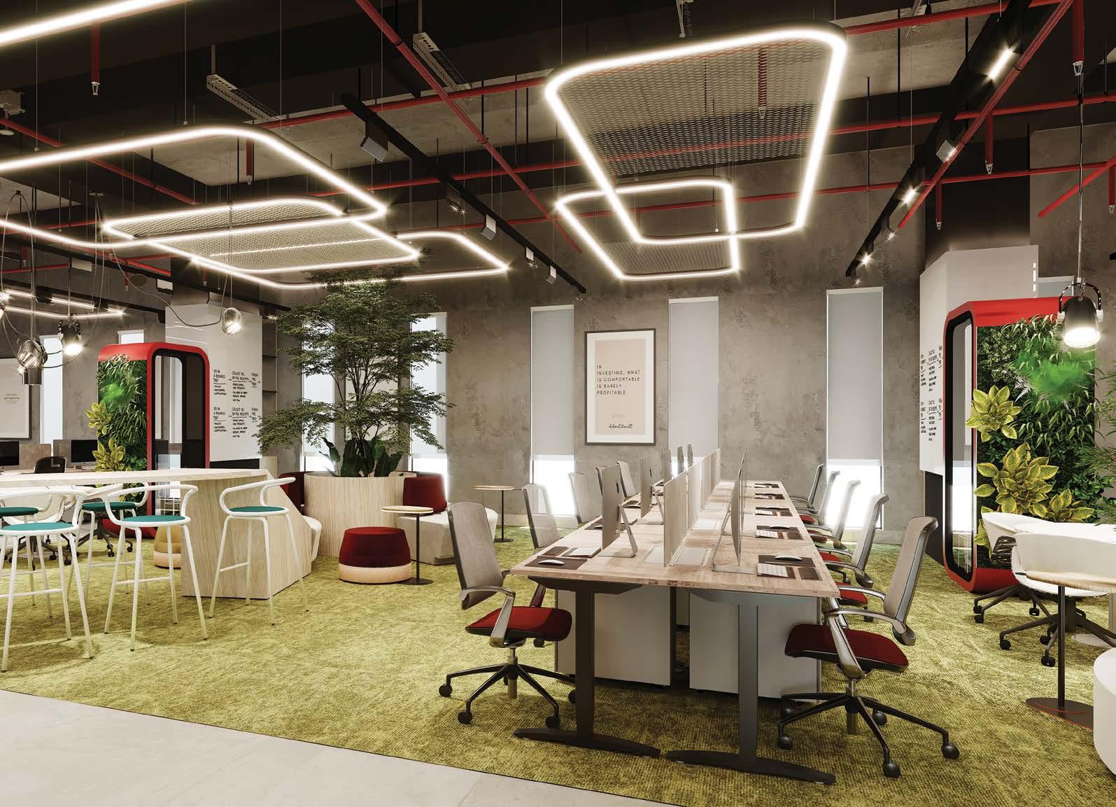 Indoor plants add life and warmth to the interior, while unique and contemporary lighting fixtures as accents and wall paintings can create a cutting-edge workspace.