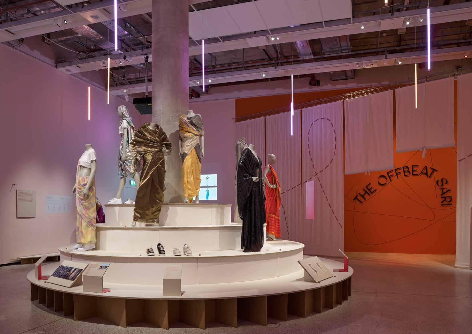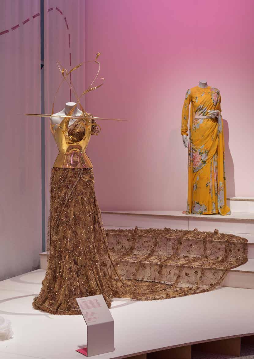 In recent years the sari has become a site for design innovation and experimentation. This section of the exhibition analyses the work of designers who have been party to this trend and are pushing the boundaries of the sari, through the creation of new genres of sari that have influenced streetwear and enabled it to be an object of playful expression. It also explores the work of conceptual designers who have used the sari as their canvas and created innovative forms such as the stitched sari dress, which demonstrate the ways in which the garment has been open to hybrid cultural influences.