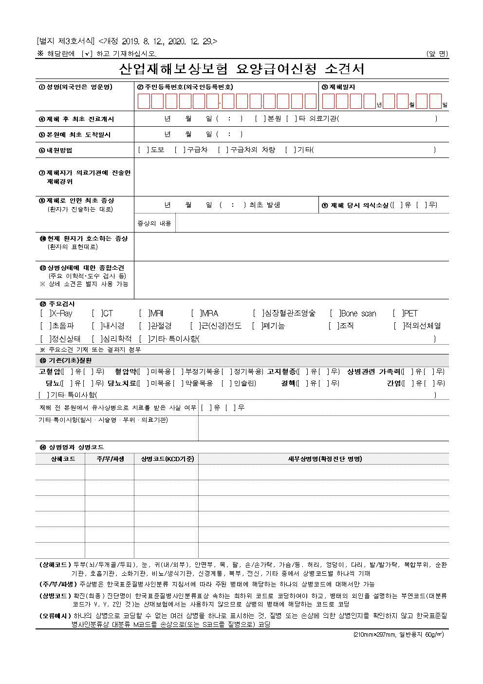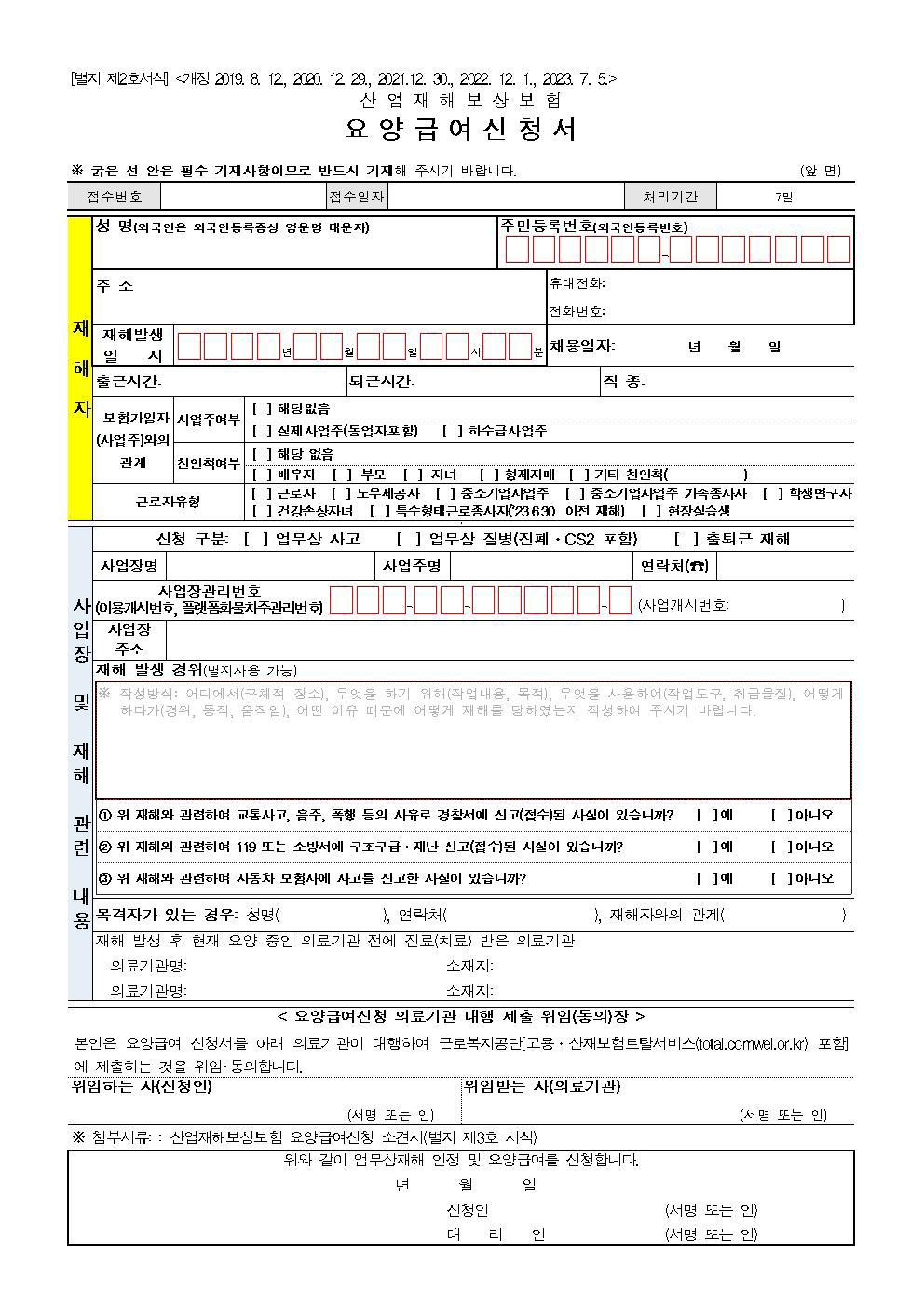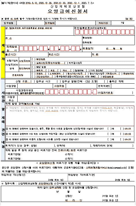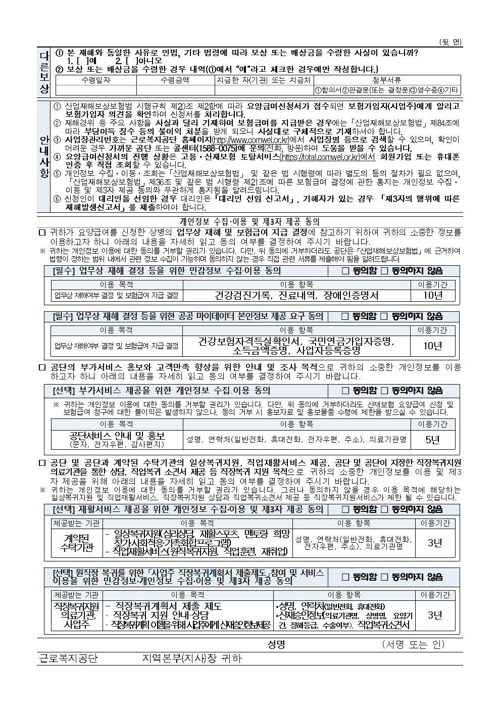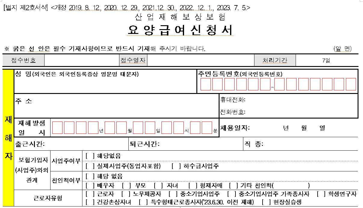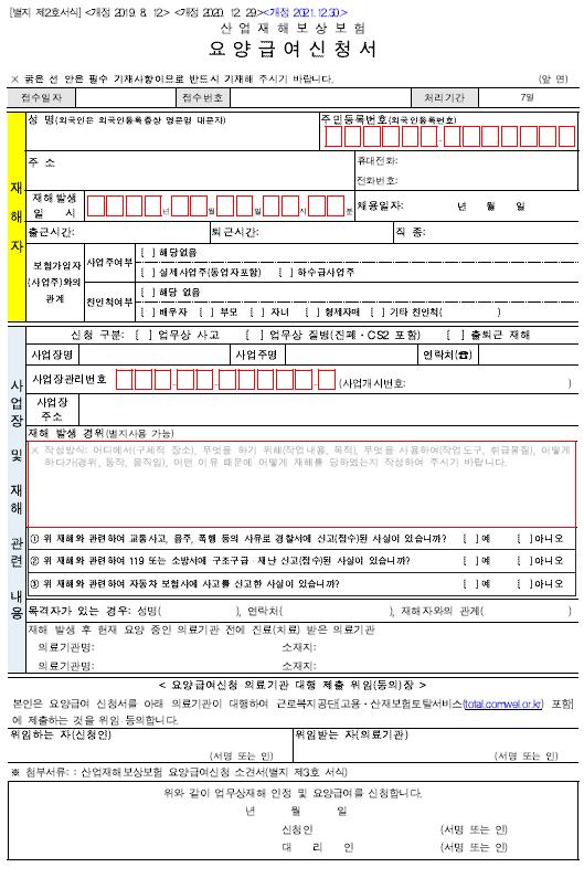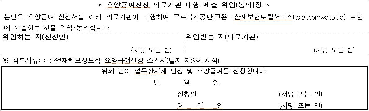 - 업무상 사유로 부상을 당하거나 질병에 걸려 4일 이상 요양이 필요한 경우에는 근로복지공단에 ‘요양신청서’를 제출하여 승인받아야 합니다. - 요양신청서 작성, 제출에 사업주의 승인을 받을 필요가 없습니다