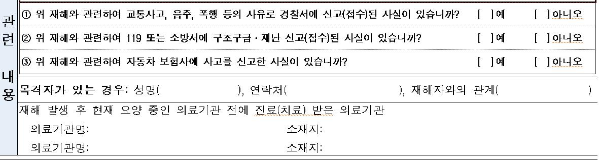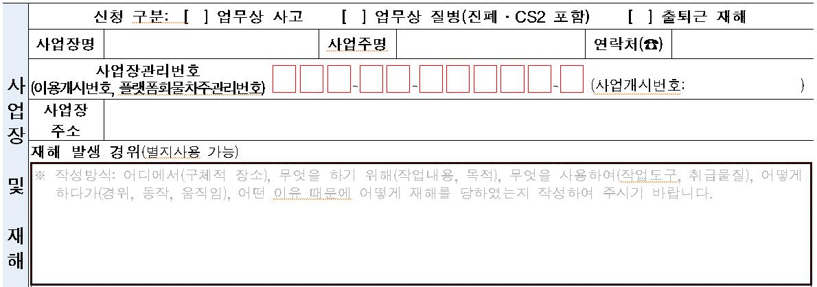 - 요양신청서 상의 재해발생경위는 업무상사고, 업무상질병, 출퇴근재해를 구분하여 상세하게 사고 경위 또는 신체부담작업 등을 서술하고 관련