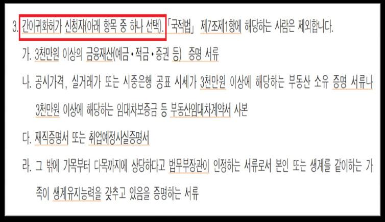 라 그 밖에 가목부터 다목까지에 상당하다고 법무부장관이 인정하는 서류로서 본인 또는 생계를 같이 하는 가족이 생계유지능력을 갖추고 있음을 증명하는 서류 3. 간이귀화허가 신청자(아래 항목 중 하나 선택).「국적법」 제7조제1항에 해당하는 사람은 제외합니다 가 3천만원 이상의 금융재산(예금ㆍ적금ㆍ증권 등) 증명 서류 나 공시가격 실거래가 또는 시중은행 공표 시세가 3천만원 이상에 해당하는 부동산 소유 증명 서류나 3천만원 이상에 해당하는 임대차보증금