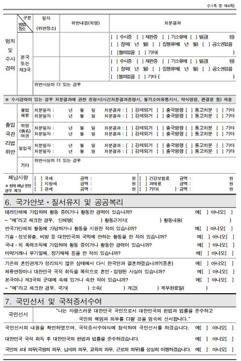 ‣ 수사경력이 있는 경우 검찰청에서 사건처분결과증명서, 벌과금납부증명서, 불기소이유통지서, 약식명령, 판결문 등 사건관련 서류 일체를 발급받아 제출해야 합니다 ‣ ‘출입국관리법위반’란에는 대한민국에서 불법체류, 위명여권사용, 밀입국 등 「출입국관리법」 위반사항이 있는 경우 기재하고 처분결과(강제퇴거 출국명령 통고처분 등)에 체크( √ )합니다