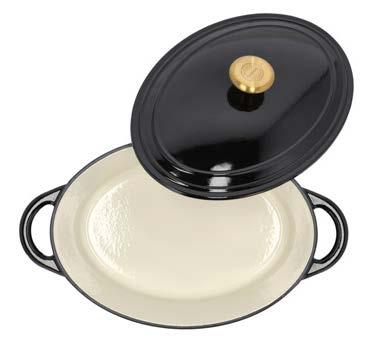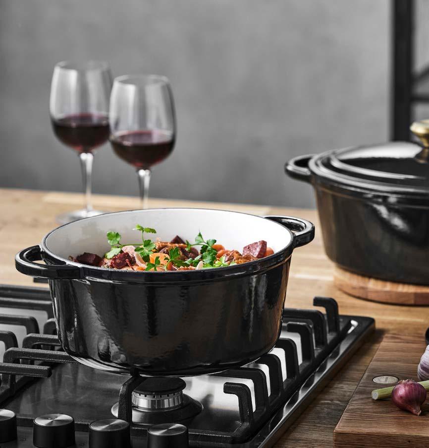 Garonne – lättviktsgjutjärn med jämn värmefördelning.Tillverkad i klassiskt gjutjärn som håller och sprider värmen jämnt. Svart blank emalj möter ljus insida, och locket har en smart droppfunktion som återför ångan till maten.