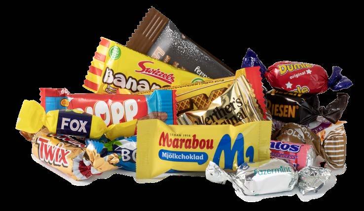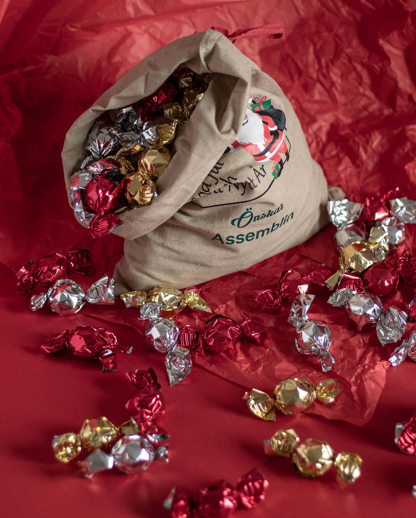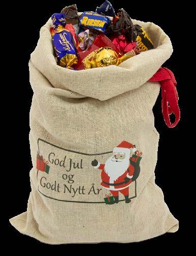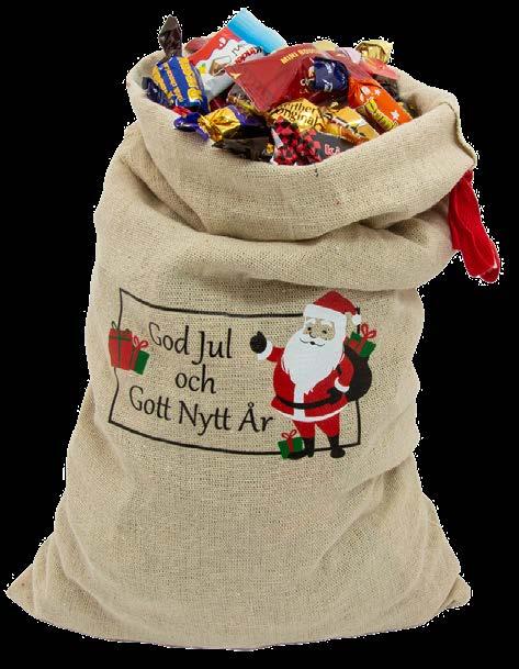 Var så god, julsäckar med försvinnande gott inslaget godis, med kända varumärken, eller pralinkulor. Välj mellan jutesäck eller vit säck. Obs! Endast 12% matmoms på julgodis.