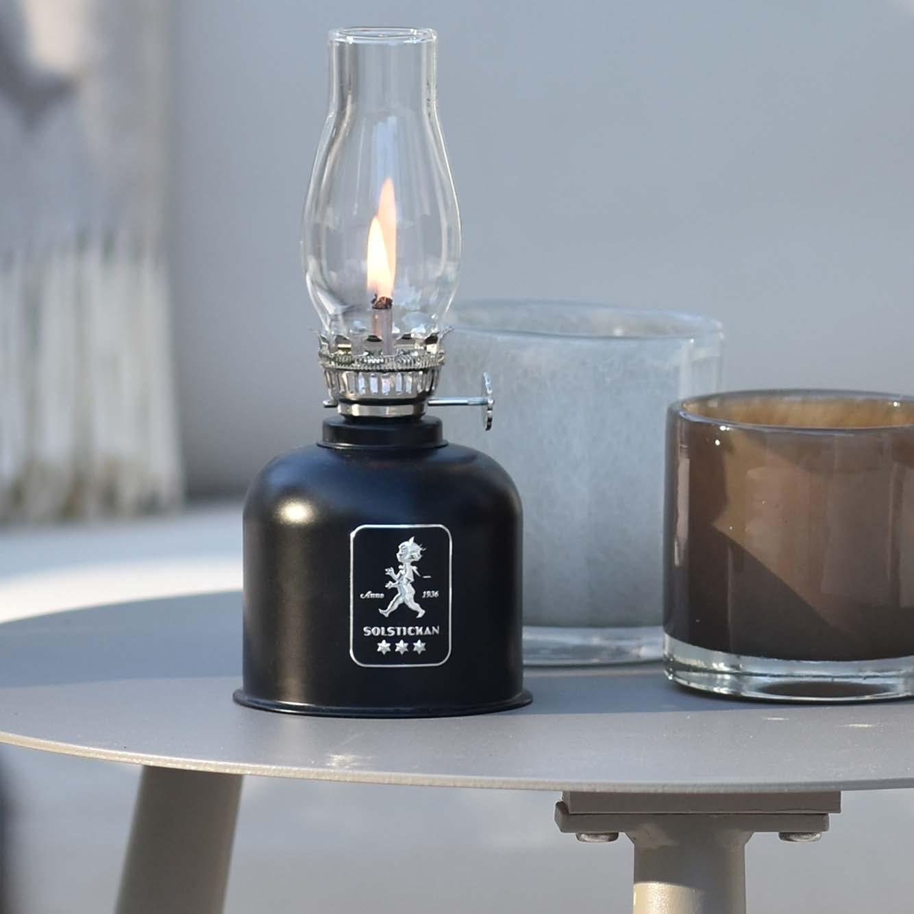 Elegant och praktisk fotogenlampa i tidlös design med emblem av den klassiska Solstickepojken. Perfekt för balkongen eller till uteplatsen, i sommarstugan eller hemmamys då de ger ett mycket bra ljus. Tändsticksasken innehåller cirka 50 st extra långa svenska kvalitetständstickor, tillverkade i Tidaholm av asp från svenska skogar. Välj mellan svart, silver, vit och guld. Lyxig presentförpackning ingår. Större antal? Begär offert!