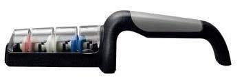 Sköt om dina knivar med Globals våtslip. Fyll den med vatten och dra kniven genom de tre sliphjulen så blir eggen som ny. Det grova hjulet återställer slöa knivar, det medelgrova underhåller skärpan och det fina ger den sista finishen.