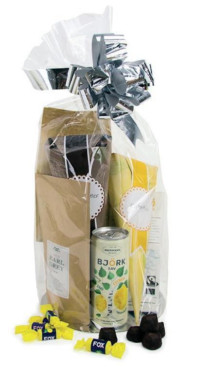 Kaffe, the & björksav med smak fulla tillbehör så som tryfflar, citron kola & en chokladkaka från Malmö choklad. Men kan också skicka med en sommarhälsning. Obs! Endast 12% matmoms.