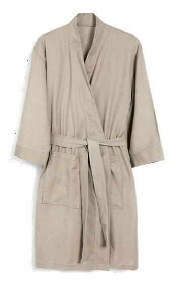 Morgonrock tillverkad av 70% certifierad återvunnen bomull, ett lätt skönt material att svepa om kroppen. Morgonrocken är av kimonomodell med vida ärmar, knytning i midjan och fickor framtill. Beige och vit, Storlek: S/M och L/XL. Exempelpris vid 50 st.