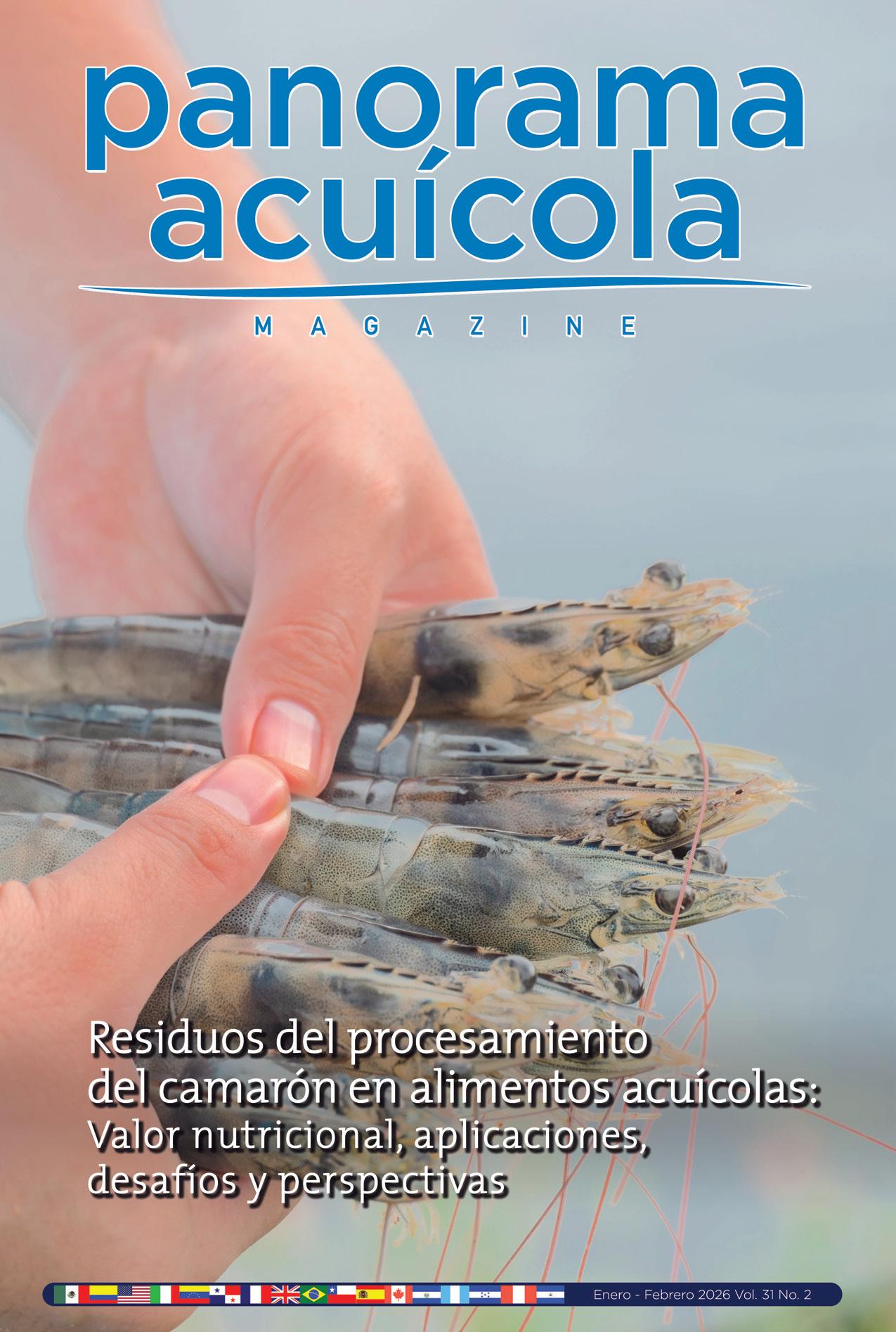PANORAMA ACUÍCOLA MAGAZINE, Año 31, No. 2, enero - febrero 2026, es una publicación bimestral editada y distribuída por Design Publications, S.A. de C.V. Av. Empresarios #135 Piso 07 Oficina 723 Col. Puerta de Hierro CP. 45116. Zapopan, Jalisco, México. Tel: +52 (33) 80 00 05 78, www. panoramaacuicola.com, info@dpinternationalinc. com. Editor Responsable: Salvador Antonio Meza García. Número de Reserva de Derechos de Uso Exclusivo 04-2019-071712292400-01, licitud de Título No. 12732, Licitud de Contenido No. 10304, ambos otorgados por la Comisión Calificadora de Publicaciones y Revistas Ilustradas de la Secretaría de Gobernación. Permiso SEPOMEX No. PP-140033. Impresa por Negocios Gráficos Grafinpren S.A. Teléfono: 04-2221362 ext 28 / 0959537917. Av. C.J. Arosemena Km 2.5 Antiguo Coliseo Granasa, Guayaquil, Ecuador. Este número se terminó de imprimir el 30 de enero de 2026 con un tiraje de 3,000 ejemplares.