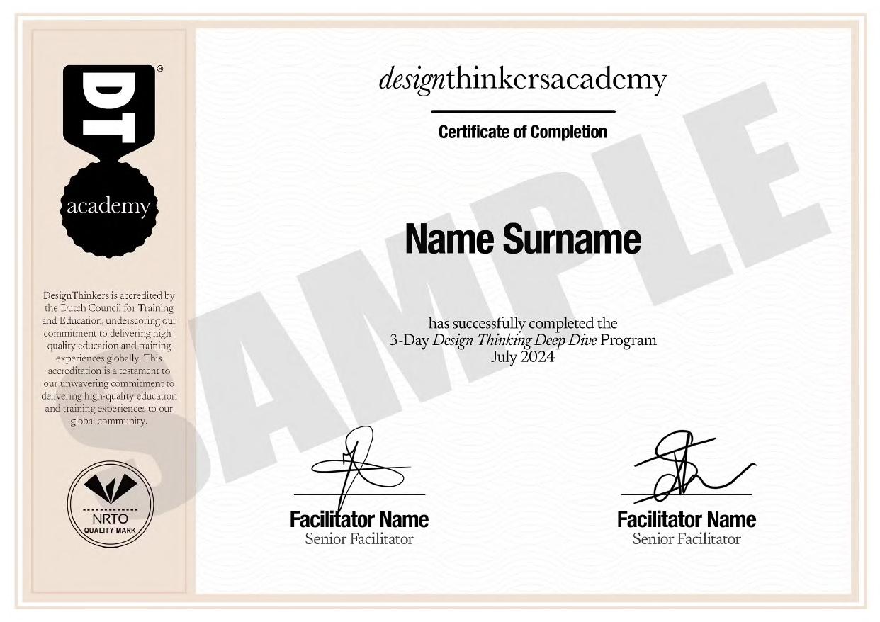 After the successful completion of one of our courses, participants are awarded with a DesignThinkers Academy Certificate. All tools and materials will be available after the course in our Learn & Develop Library (accessible to alumni only).