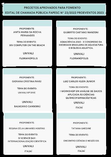 A Univali teve seis projetos aprovados na chamada pública, que tem como objetivo apoiar a realização de Eventos científicos, tecnológicos e/ou de inovação em Santa Catarina, por meio de fomento e da integração de seus agentes, objetivando o avanço de todas as áreas do conhecimento, o equilíbrio regional, o desenvolvimento econômico sustentável e a melhoria da qualidade de vida dos catarinenses.