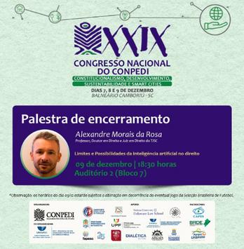 A 29ª edição do Congresso Nacional do Conpedi, evento coorganizado pelo PPCJ e com apoio do PPGDMT, aconteceu nos dias 7 e 8 de dezembro e terá seu encerramento hoje, 09/12, no campus de Balneário Camboriú às 18:30, com palestra ministrada pelo Prof. Dr. Alexandre Morais da Univali. Organizado pela Sociedade Científica do Direito no Brasil, o Conselho Nacional de Pesquisa e Pós-graduação em Direito (Conpedi), teve como tema “Constitucionalismo, Desenvolvimento, Sustentabilidade e Smart Cities", sendo uma oportunidade para difundir pesquisas em painéis e grupos de trabalhos científicos. O evento reuniu mais de 2,5 mil pesquisadores e Programas de Pós-Graduação em Direito e Ciências Jurídicas e Sociais de todo o Brasil.