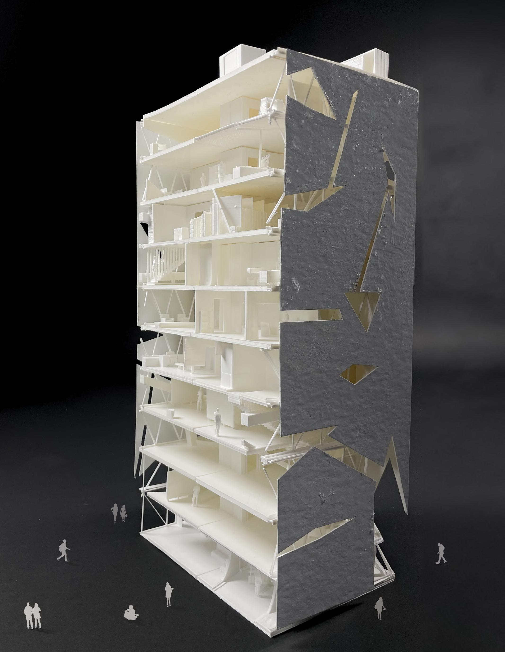 In my housing studio project, I wanted to create a residential space that tetters between public and private. I strived to maintain a sense of privacy and agency of space within each residential unit, while maximizing the potential for social gathering in every space outside of the unit. My concept of this proposal was to imagine a corridor as a means of occupiable living space rather than just a mode of travel or connection. I initially imagined this possibility of the livable corridor for the unit itself, but reimagined it on the site and used this as a basis for outlining the residential buildings. My aim was to create an urban environment within the large fragmenting corridor, allowing for varying degrees of social habitation and giving residents a variety of choices/opportunities in how they might want to navigate their living environment.