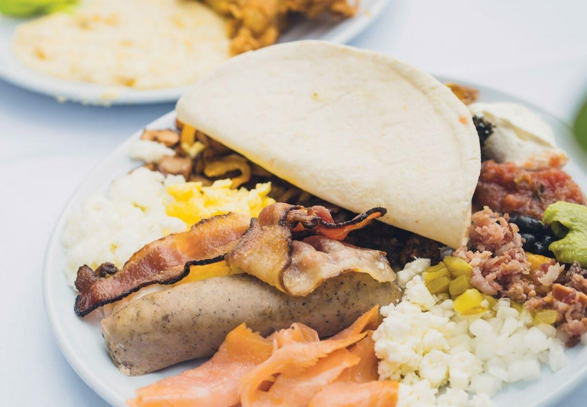 Selection of Natalie’s Fresh Squeezed Juices, Breakfast Burrito with Egg, Sausage, Peppers, Cheddar Cheese, Salsa, and an Apple