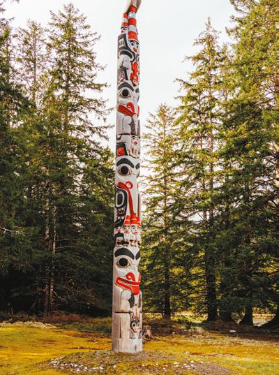 Towering trees, with trunks wide enough to encompass the stories of generations, create a natural cathedral, casting dappled shadows on the forest floor below my feet. There was no evidence of human occupation on Xayana aside from a 45-foot totem pole towering overhead, guarding the desolate island like a silent sentinel. Though this particular pole was new, (having been raised in memoriam of Kaay’ahl Laanas hereditary chief Watson Price just that year) it resembled many time-worn totems I had seen in Skidegate and Massett in the days preceding.