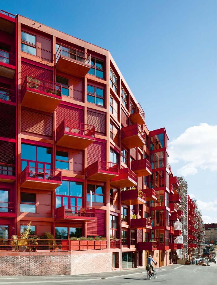 Robertneun entwickelte städtebauliche Vorgaben für die gesamte Zeile mit 15 Häusern und etwa 220 Wohnungen sowie Gewerbe-, Bar- und Atelierräumen im Sockelgeschoss. Neben klassischen Eigentumswoh nungen des Investors wurden zwei Häuser von Baugruppen errichtet. Die Grundstruktur besteht aus Parzellen, die bei gleicher Tiefe 7, 14 oder 21 Meter breit sind; die Architekten sprechen von S, M und L. Durch die verschiedenen Größen sollte ein breites Angebot unterschiedlicher Wohnungstypologien und -größen entstehen. Alle Gebäude bilden einen gemeinsamen urbanen Sockel aus roten Backsteinen, der die Höhendifferenz von bis zu 7 Metern auf der ganzen Länge ausgleicht. Ebenfalls vorgegeben waren die zu verwendenden Materialien sowie die Rottöne für pigmentierten Beton, Metall und recycelte Ziegelsteine, die sich aus dem industriellen Umfeld und vor allem aus der Architektur des alten Lokdepots ableiten. Sieben der 15 Gebäude wurden von Robertneun entworfen. Sie demonstrieren die architektonischen Möglichkeiten innerhalb der Vor gaben: Im Sockelgeschoss zelebrieren die Eingänge die imposante Etagenhöhe mit gewaltigen Eingangstoren und riesigen Hausnummern. Die sechs Etagen darüber bieten auch in den schmalsten Häusern eine große Wohnungsvielfalt: Einzimmerapartments, die bei Bedarf mit benachbarten Maisonetten verbunden werden können, Etagenwohnungen oder Durchsteckwohnungen mit ineinandergesteckten Split-Leveln. Auch die Fassaden zeigen die innere Vielfalt, mal mit einem vor das Haus gestellten Metallregal für tiefe Loggien, mal mit weit aus der Fassade ragenden Bal konen. Übrigens wirkt das kräftige Rot vor Ort nicht wie eine Provokation; es zeigt im Gegenteil eine erstaunliche Selbstverständlichkeit. fh