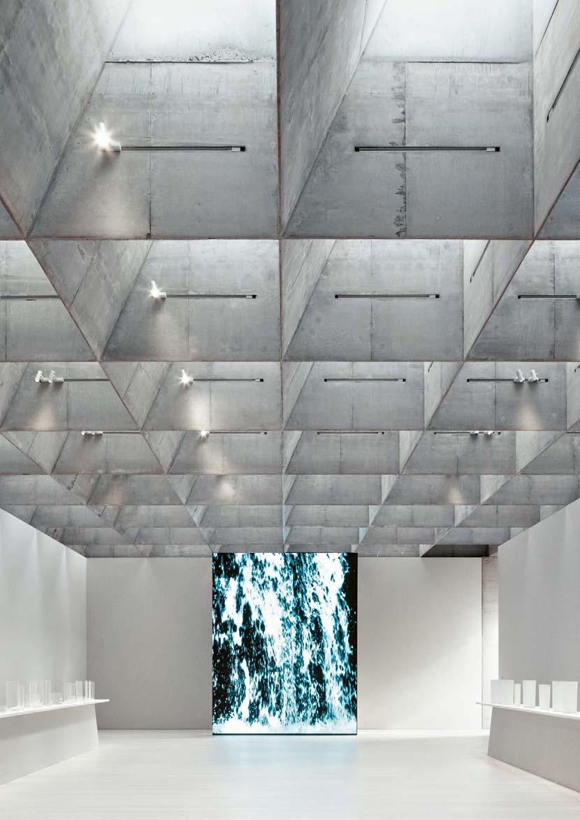 The sheer mass of concrete defines the spatial impression on the upper levels. The lateral walls of the lightwells taper down ward and terminate in sharp edges above the space. As a result, the construction appears filigree and weightless. In addition, the many roof apertures allow daylight to enter the space in an unusually homogeneous manner. The view towards the sky is unobscured. Heaviness and weightlessness are united in the form of an impressive spatial work of art. RP