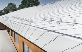 heraus: Im Mittelpunkt standen dabei drei helle Zentralräume, die als Bewegungsund Aktionsflächen dienen und die ver schiedenen Schwerpunktbereiche wie etwa Mathematik oder Sprachen mitein ander verbinden. Nach außen zeichnen sie sich als Erhebungen ab, die – statt mit Gipfelkreuzen – mit großflächigen Ober lichtern aufwarten. Bei der Ausführung waren Ortgang- und Trauflösungen ge fragt, die ohne Überstand funktionieren und die unterschiedlichen Dachneigun gen harmonisch zusammenführen.