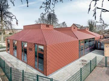 Eine Haut aus roten Rauten legt sich um den Erweiterungsbau einer Kindertages stätte in Hennstedt. Mit der Wahl der Gebäudehülle schaffen Jebens Schoof Architekten Bezüge nach außen und nach innen: Die rote Farbe nimmt Bezug auf die Ziegelfassaden der Umgebung, und Zeltdächer prägen bereits den angren zenden Bestandsbau. Die Raute hingegen findet sich auch im Inneren des Neubaus in Holztafelbauweise wieder. Über den zentralen Raum zum Essen, Turnen und Spielen spannt sich – getragen von v-för