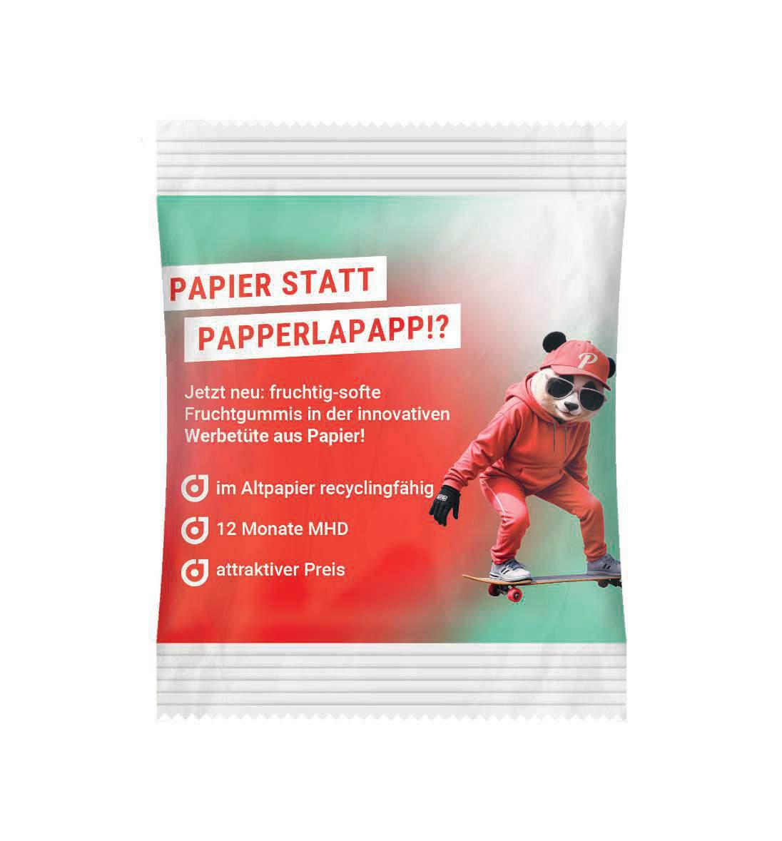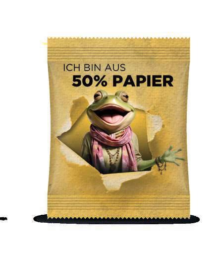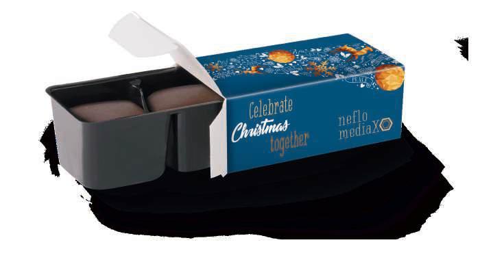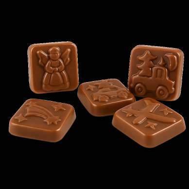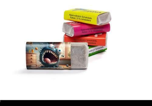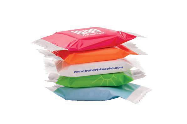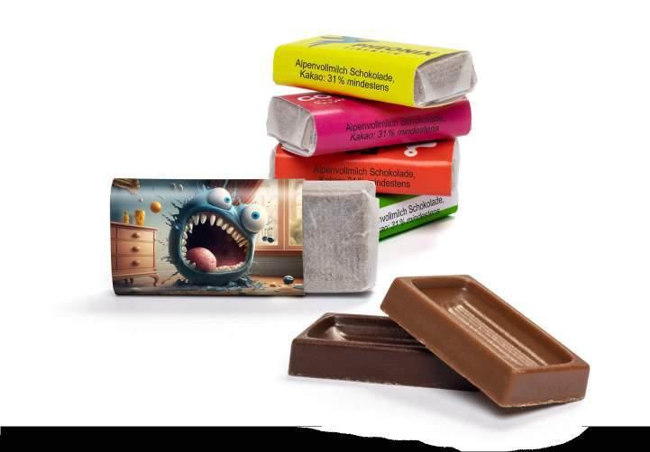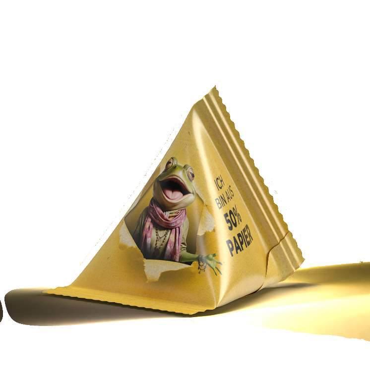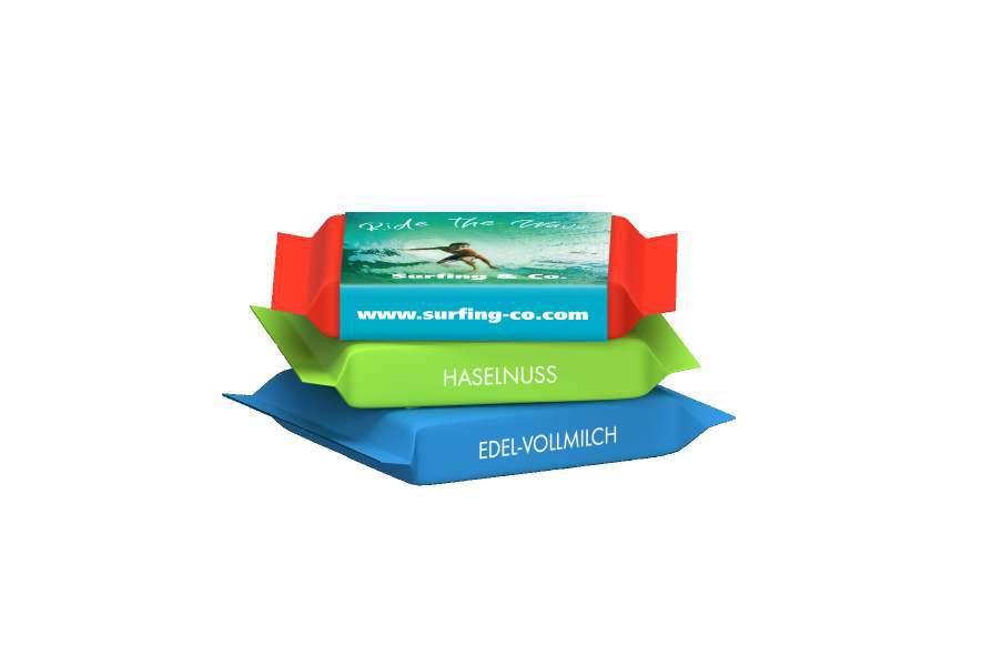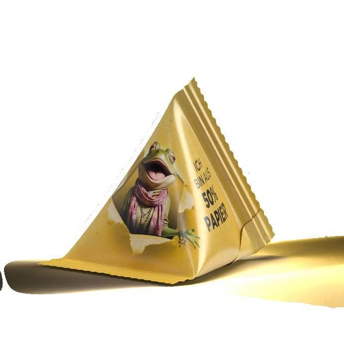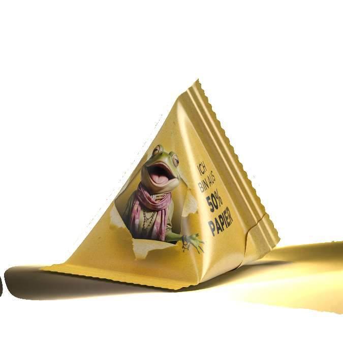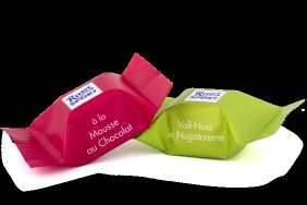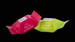 All three chocolate products are packaged in 100% recyclable glassine paper, almost unique on the advertising treats market. Glassine paper is semi-transparent. The material is grease- and splash-proof making it ideal to protect mouthwatering confectionery. The paper is 100% recyclable and can be disposed of with waste . A clean solution.