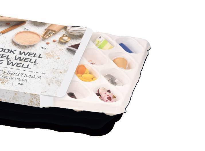 Hidden behind 24 little doors, but genuine stars nonetheless – our environmentally friendly cardboard inlays. These are made from 100% paper so that they can be returned to the recycling circuit. They can be disposed of quite simply in the paper bin. The cardboard inlay variants also score highly in terms of environmental friendliness in the manufacturing process: for example, the pressure-formed cardboard inlays require only a fraction of the energy needed to produce their plastic counterparts.