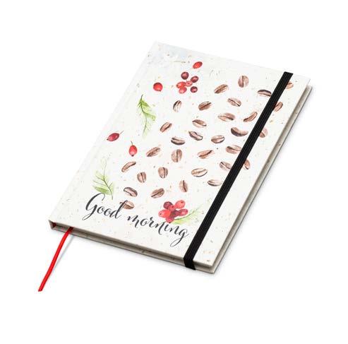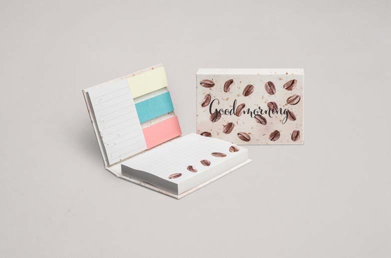 Agro-industrial coffee waste can be used to make paper, contributing to a decrease in deforestation. They are suitable for both soft and hard covers of sticky notes sets, Mindnotes notebooks and diaries. Visible spots of coffee add character to this paper, thanks to which your notebooks will garner attention due to their unique look.