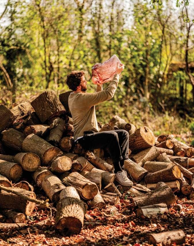 À DROITE NICOLAS ERAUW SOUFFLE SES VASES SCULPTURAUX DANS LES CAVITÉS DES TRONCS D’ARBRES, CE QUI MET EN VALEUR LES NŒUDS ET LES EMPREINTES DE L’ÉCORCE.