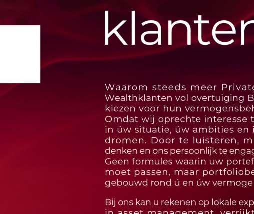 Wij zien een partner voor uw vermogen. Iemand die u persoonlijk kent en ondersteund wordt door de expertise van één van de grootste inanciële groepen ter wereld. Zo kan zij u gericht adviseren om uw beleggingen te optimaliseren in lijn met uw doelstellingen en persoonlijke situatie.