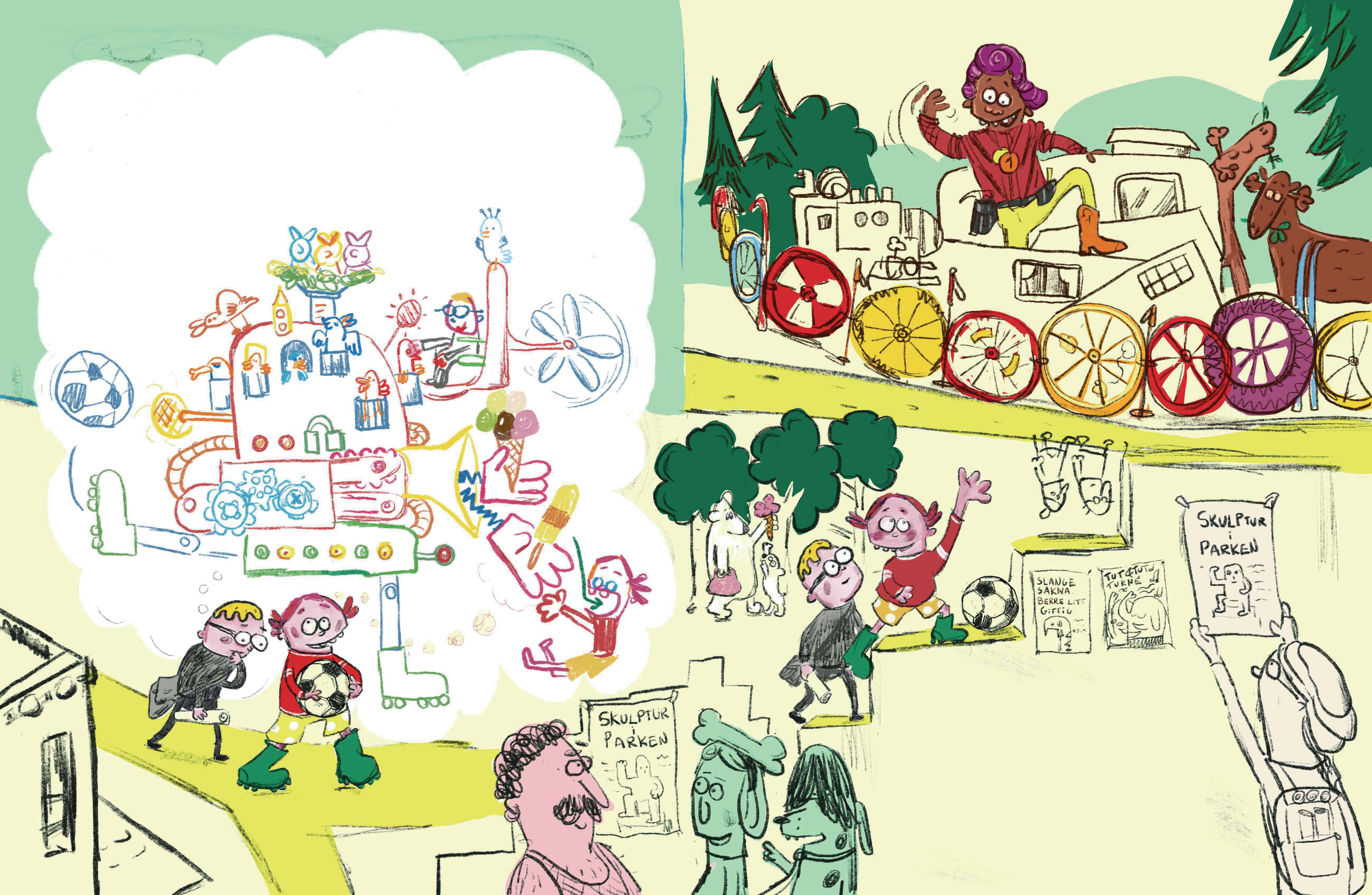 – Kanskje vi kan bygge noko der ein både kan sjå på fuglar og lage is? seier Kåre. Marimba synest ein burde kunne spele fotball med oppfinninga i tillegg.