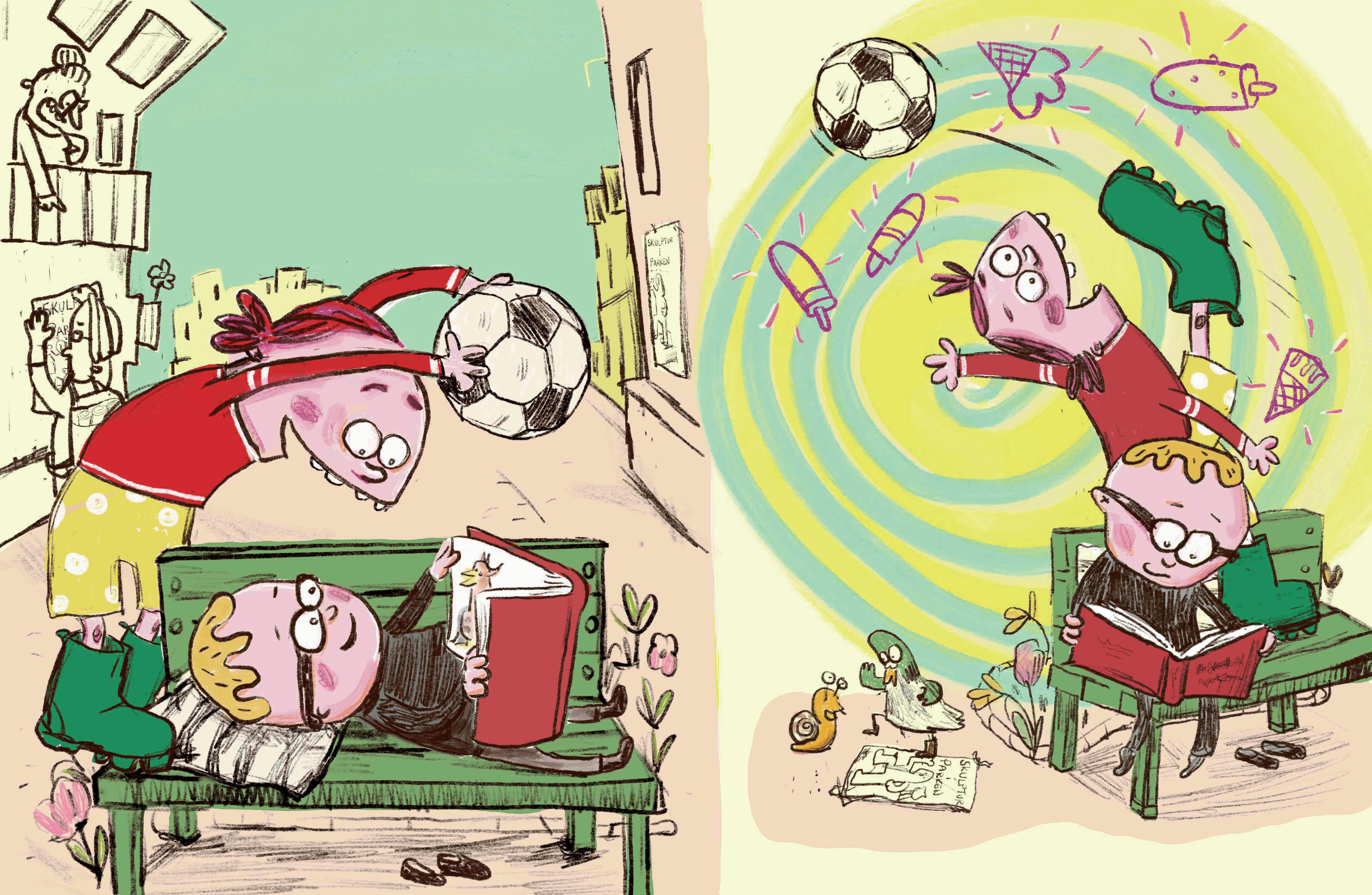 – Eg har fått ei ny bok som handlar om fuglar, seier Kåre. – Eg har fått ein ny fotball som handlar om å springe rundt og leike, seier Marimba.