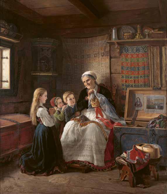 Tidemand gjennomfører mange studiereiser i Noreg. Gjennom skisser fangar han livet og kulturen til bonden. Han dokumenterer tradisjonar og folkedrakter og vert rekna for å vera ei påliteleg kjelde blant folkedraktgranskarar. I dette måleriet frå 1860–1869, sit ei kvinne og viser fram ei krone til to barn. Brurekroner er eit hovudplagg som tradisjonelt vart bore av brura på bryllaupsdagen.