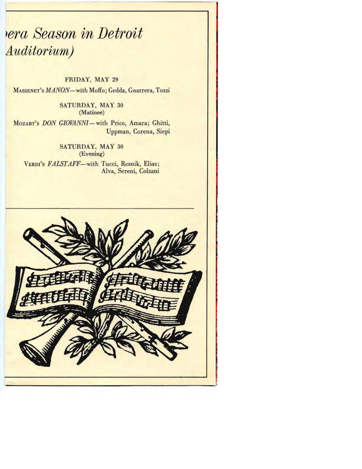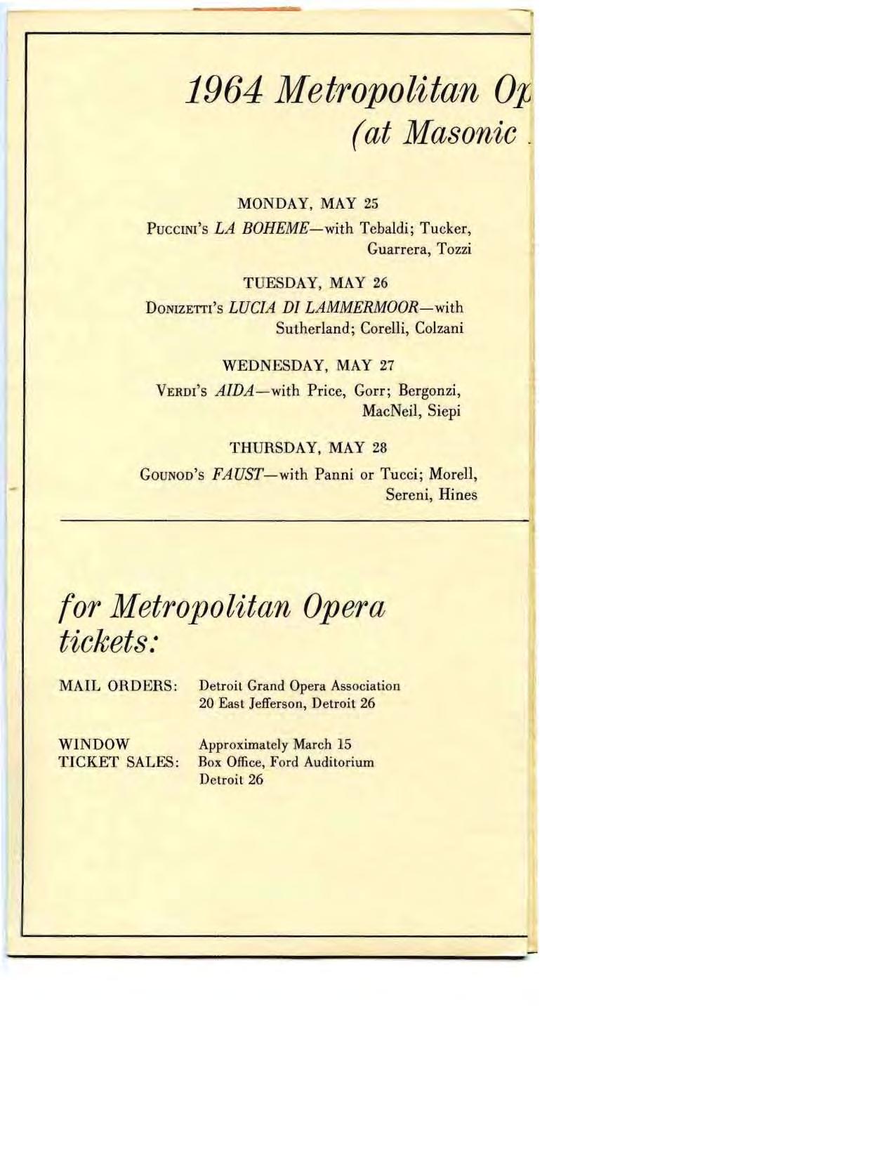 A program of scenes from operas to be performed by the Metropolitan Opera Company during its 1964 Detroit season. To be given twelve times in the Metropolitan area of Detroit as lis ted.