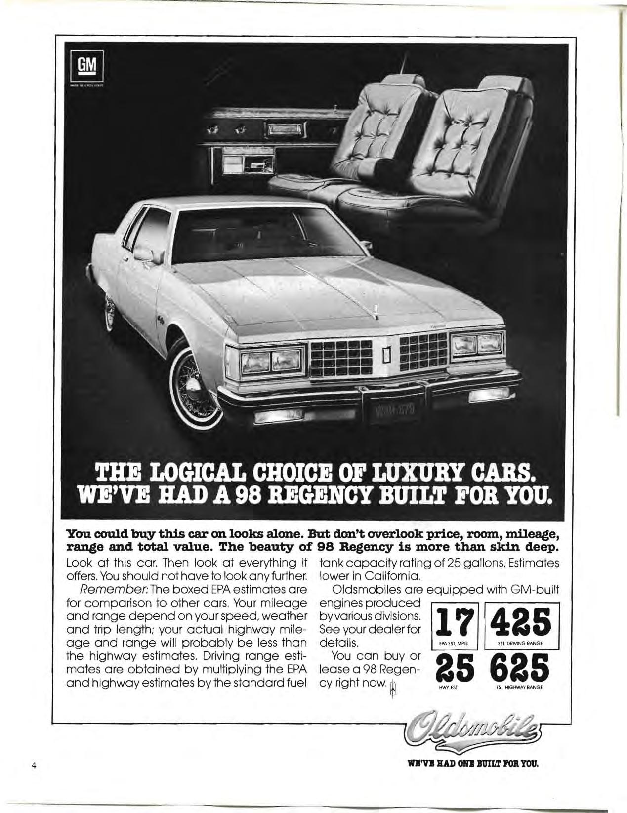 Remember: The boxed EPA estimates are Oldsmobiles are equipped with GM-built for comparison to other cars. Your mileage engines produced and range depend on your speed, weather by various divisions. and 'trip length; your actual highway mile- See your dealer for age and range will probably be less than details. the highway estimates. Driving range esti- You can buy or mates are obtained by multiplying the EPA lease a 98 Regenand highway estimates by the standard fuel cy right now.