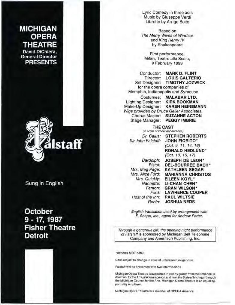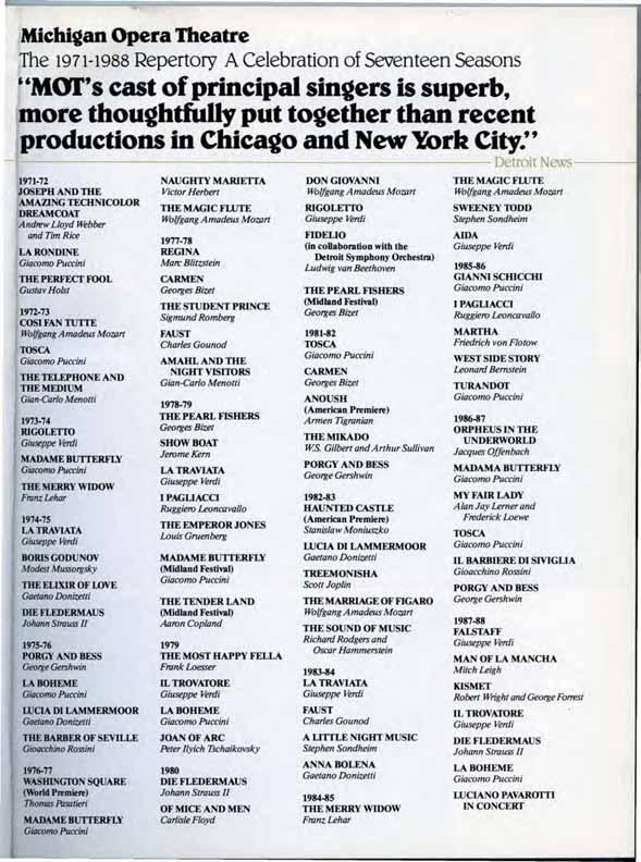 AsI contemplate the dramatic growth and national prominence that Michigan Opera Theatre hasrecentlyachieved,Iam continuously "caught by surprise" bythe significant milestones which occur in both our personal lives and the maturation of the institutions withwhichweare affiliated. It wastwentyfiveyearsago that Ibegan producing under theaegis of the Detroit Grand Opera Association, a program called Overture To Opera