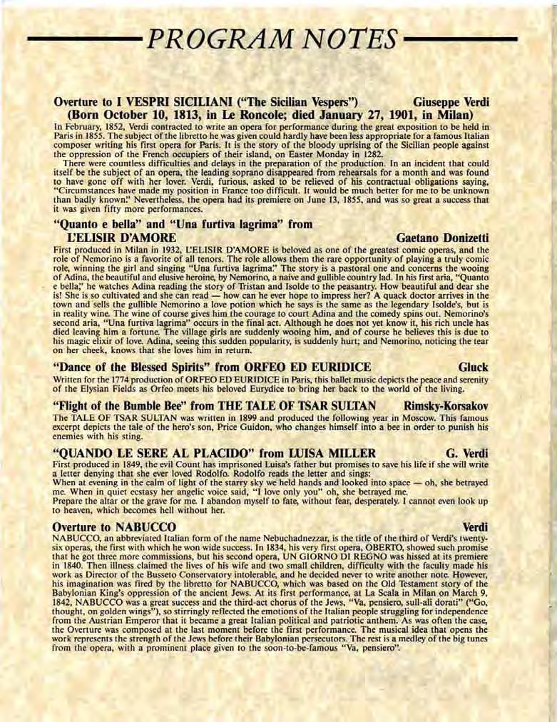 NABUCCO,an abbreviated Italian form of thename Nebuchadnezzar, is thetitle of thethird of Verdi'stwentys ixop eras,t hefir st with whichhewonwide success In1834,his veryfirst opera, OBERTO,showedsuchpromise that hegotthreemore commission s, buthissecond opera , UN GIORNO DI REGNO washissedatitspremiere in 1840. Thenillnessclaimedthelives of hiswifeandtwosmallchildren , difficulty withthefacultymadehis worka s Di rector of theBusseto Conservato ry intolerable,andhedecidednever towrite another note.However, his imagination was firedby the libretto forNABUCCO,whichwasbasedontheOldTestamentstoryofthe Bab ylonian King's oppression of the ancient Jews.Atitsfirst performance, at La ScalainMilanonMarch9, 1842, NABUCCO wasagreatsucce ss andthe third-act chorus of theJews," Va,pensiero,sull-ali dorati" ("Go, thought, ongoldenwings"), so stirringly reflectedthe emotions of the Italian people struggling for independence fromthe Austrian Emperor that itbecameagreat Italian politicaland patriotic anthem . Aswas often thecase, theO verture was composed atthelast moment beforethefirst performance. Themusicalidea that opensthe workrepresentsthe strength of theJewsbeforetheir Babylonian persecutors. Therestisamedley of thebigtunes fromtheopera,witha prominent placegiventothe soon-to-be-famous "Va , pensiero".