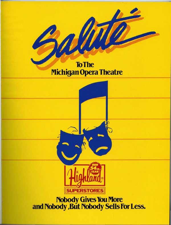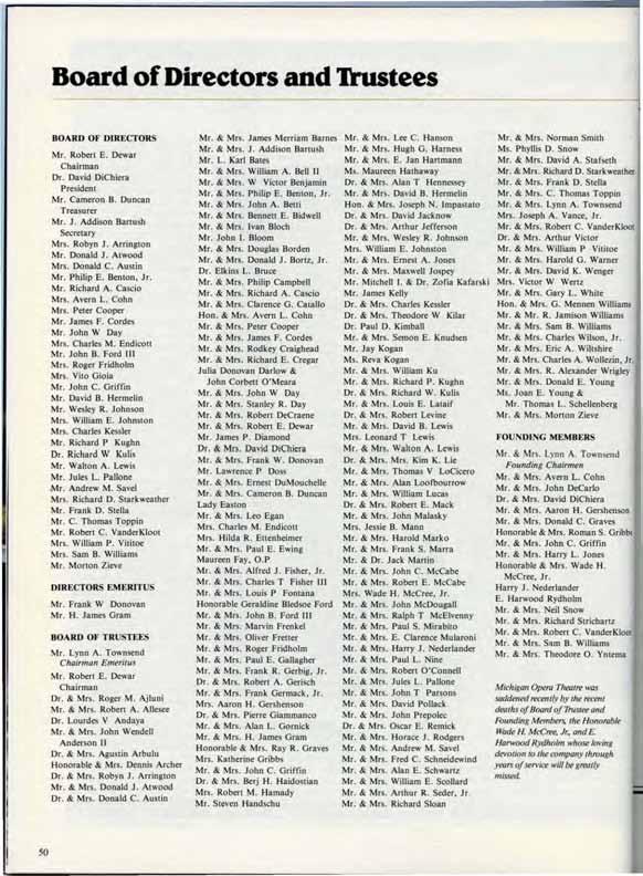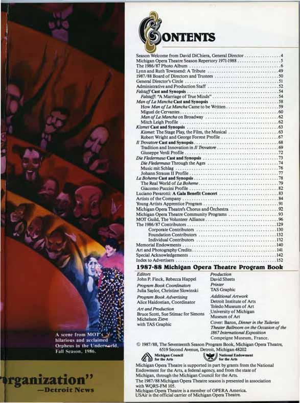 In subsequent years,Ruth's devotion andservicetothesuccess of Overture to Opera extended toher husband Lynn.Togetherthey provided theloyaltyand leadership whichplayeda leading rolein bringing Michigan Opera Theatre toits current status. After twentyfiveyears of dedicated servicetothe company and upon the occasion of Lynn's retirement to emeritus status as Chairman of the Board of Trustees,itseemsonly natural that we should fondly dedicate thisnew opera season to both Ruth and Lynn.