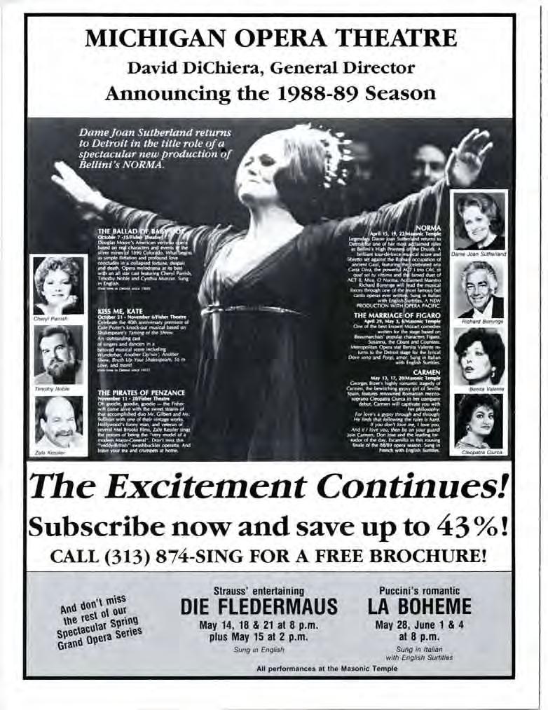 I urge you to join the nearly 10,0 00 other Michigan Opera Theatre subscribers and musical theatre lovers and guarantee your seatsby subscribing to our18th anniversary season. Whether you 're a newcomer or a veteran of se venteen seasons likeme ,you won't want to missa single performance in our upcoming season. Please contact our ticket servicesofficeat ( 313) 874-SING forafree brochure. I look forward to seeing youat the opera