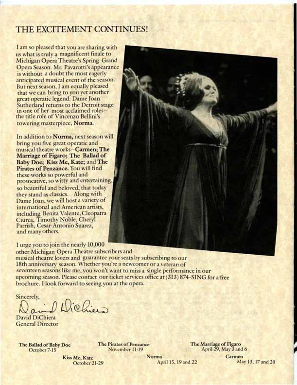 Iamso pleased that youare sharing with us what is truly a magnificent finaleto Michigan Opera Theatre 's Spring Grand Opera Season. Mr. Pavarotti 's appearance is without a doubt the most eagerly anticipated musical event of the season. But next season, Iam equally pleased that wecan bring to youyet another great operatic legend. Dame Joan Sutherland returns tothe Detroit stage in one of her most acclaimed rolesthe title role of Vincenzo Bellini's towering masterpiece, N o rma.