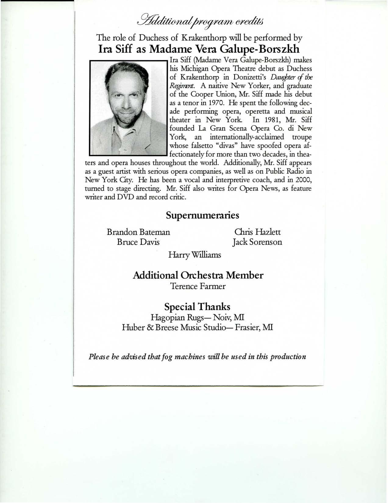Ira Siff (Madame Vera Galupe- Borszkh) makes his Michigan Opera Theatre debut as Duchess of Krakenthorp in Donizetti's DaufiJter if the RegjrrEnt. A naitive New Yorker, and graduate of the Cooper Union, Mr. Siff made his debut as a tenor in 1970. He spent the following decade performing opera, operetta and musical theater in New York