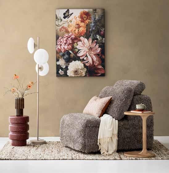 wandpaneel Vintage Flowers vanaf €198 vloerlamp Sapporo 161xØ32 cm €399 bijzettafel Spatter €159 laptoptafel Fenix €99 vloerkleed Takara vanaf €279