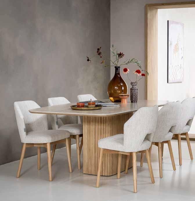 Het zandkleurige blad van Dario is gemaakt van sintered stone, een supersterk materiaal dat ook wordt gebruikt voor aanrechtbladen. Het blijft jarenlang mooi en is eenvoudig te onderhouden. In combinatie met de tafelpoot met halfronde houten latjes is Dario helemaal van nu.